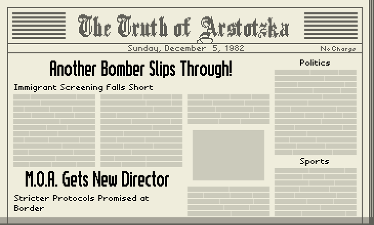 - Letting a randomly generated smuggler (i.e. a person with invalid weight) through can lead to a terrorist attack, cutting the day short at some point after the ninth entrant. This can also happen by letting through a randomly generated diplomat with valid papers.
