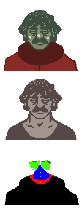 The appearance of entrants and their photos is procedurally generated. The game has 32 premade faces for entrants (16 for both sexes), four faces for officers (Calensk, Sergiu, M. Vonel, and Dimitri), and one face for EZIC messengers. There are two versions of each face; one for the entrant in the booth and another for their photo. For each face, there is also a separate layer picture which marks the eye area, jaw, shoulders, and nose and mouth. The layer also contains information about the location of eyes, nose, mouth, and jaw. Parts from different premade faces are then combined to generate faces and photos of entrants.